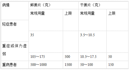 针对每姜的用量,虽无定法,但依病情,提供下表参考: