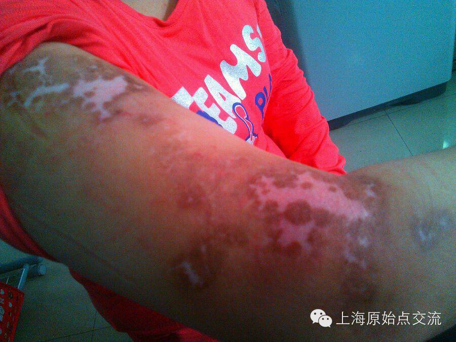 似白癜风案在莲花调理中心的治疗一次的分享女,北京人,今年二十多岁,手臂烫伤己二年多,如今象白癜风的花纹,想用原始点治疗,我们给她按推肩甲原`始点,温敷,回家告诉她用生姜汤洗患处,再将姜粉与姜汤搅拌糊状敷在患处,第二次来,自术患处痒,而且白花纹有变红的现象,还在治疗中!白癜风和牛皮癣一样属24小时症状比较难治。但用原始点来看也是属于寒症。按推、喝姜汤、温敷一个也不能少,而且要坚持很久。原始点是有效的治疗,而不是骗钱,应付病人,是努力的改善患者的体质。也是唯一有希望的治疗!